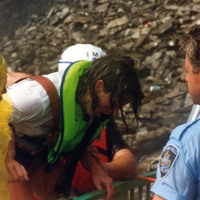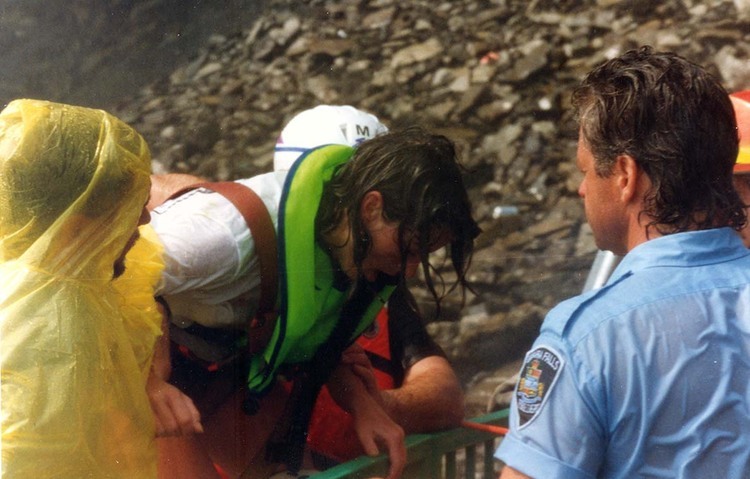 - Lori Martin being rescued after she and Steve Trotter went over the Horseshoe Falls in a barrel.