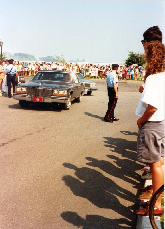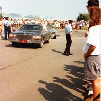en-CA Duke and Duchess of York (Andrew and Sarah) arrive at Table Rock House in a limousine. A large crowd waits to greet them.