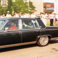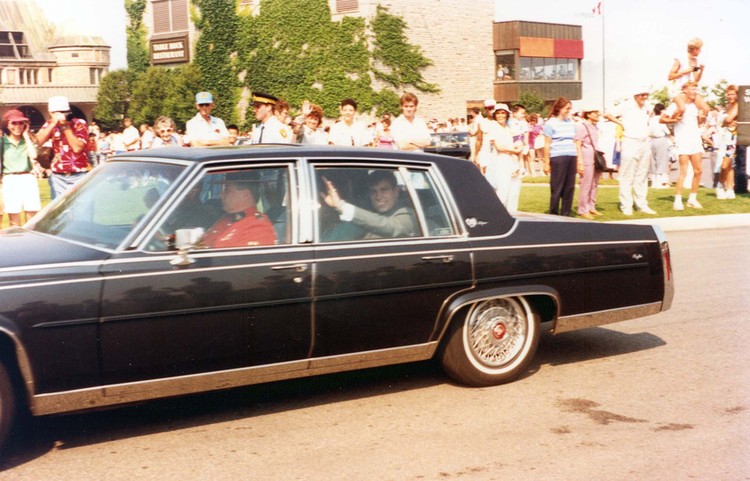 en-CA Duke and Duchess of York (Andrew and Sarah) arrive at Table Rock House in a limousine. A large crowd waits to greet them.
