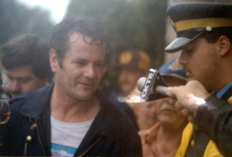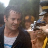 John "David" Munday being interviewed after his trip over the Horseshoe Falls in a homemade barrel on Sept 26, 1993