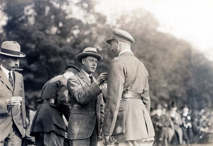 - en-CA Prince Edward, Prince of Wales (future Edward VIII and Duke of Windsor) on royal tour of Canada in 1919 visits Niagara Falls. Prince Edward pinning a medal on soldier.