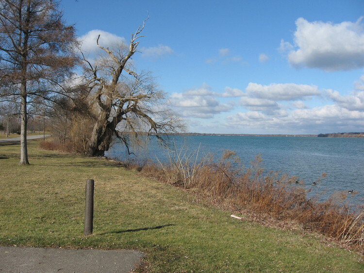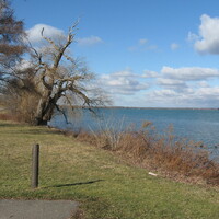 - en-CA Geese in the Upper Niagara River and a gnarled tree along the shore near Beam Road.