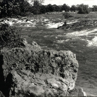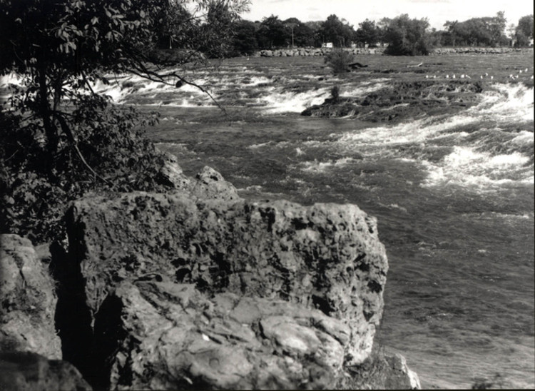 - en-CA Upper Niagara River depicting the cascades at Goat Island with the American shore in the background and a weathered rock in the foreground.