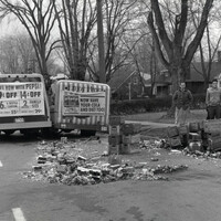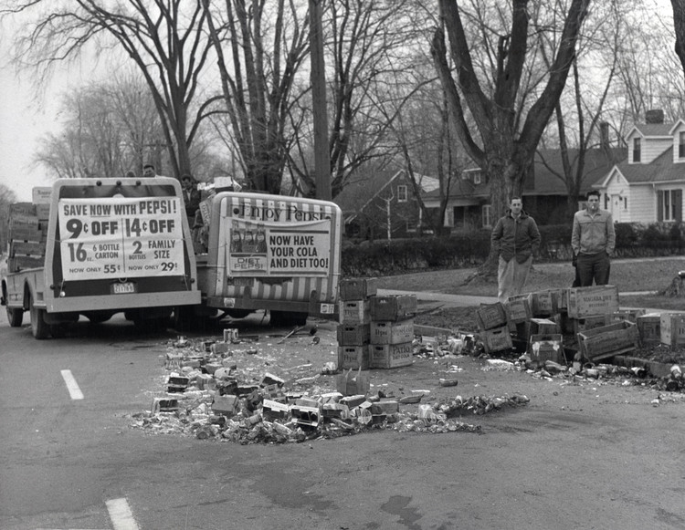 - en-CA Accident involving a Pepsi truck in which wooden crates have fallen all over the road.