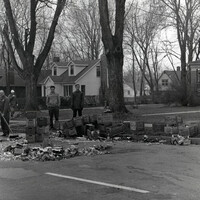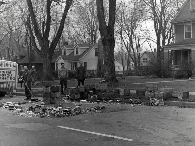 - en-CA Accident involving a Pepsi truck in which wooden crates have fallen all over the road.