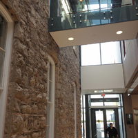 - Interior view of the newly renovated museum ; the main lobby area with skylight ; stone wall from the old building left ; Janice Leak Systems Administrator Niagara Falls Public Library in background ;