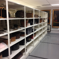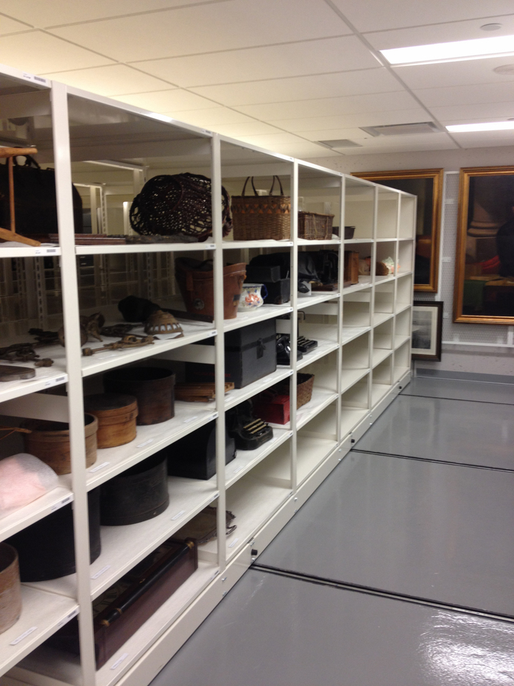 - Interior view of the newly renovated museum ; artifacts storage area ; baskets and boxes arranged on shelving ; artwork on walls in background ;