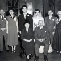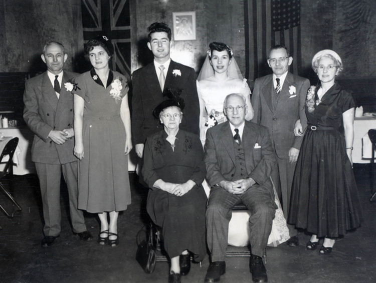 - en-CA To the right of the groom are Mr. & Mrs. McGarry, then the bridal pair, Robert McGarry and Betty Whipp. On the left are the parents of the bride, Fred and Dorothy Whipp. In front are Annie and William Miller.