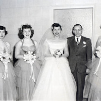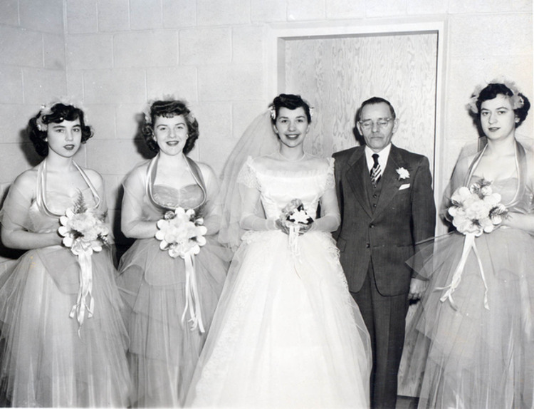 - en-CA The bride, Betty Whipp with her father, Fred Whipp at her side and with the bridesmaids.