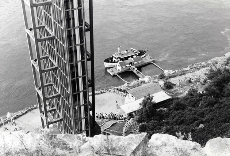 - en-CA Maid of the Mist docked on the American side under Prospect Point Observation Tower.