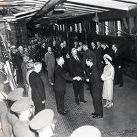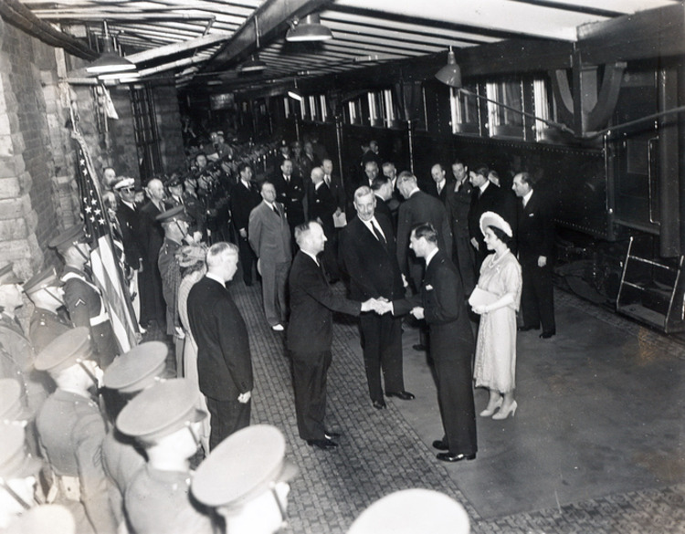 - en-CA King George VI and Queen Elizabeth shake hands of various dignitaries before boarding the royal train at the Bridge Street Station.