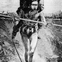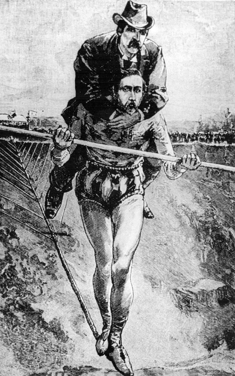 Blondin carries his assistant Romain Mouten across the Niagara Gorge