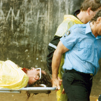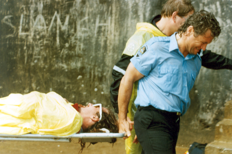 - Steve Trotter being rescued after he and Lori Martin went over the Horseshoe Falls in a barrel.