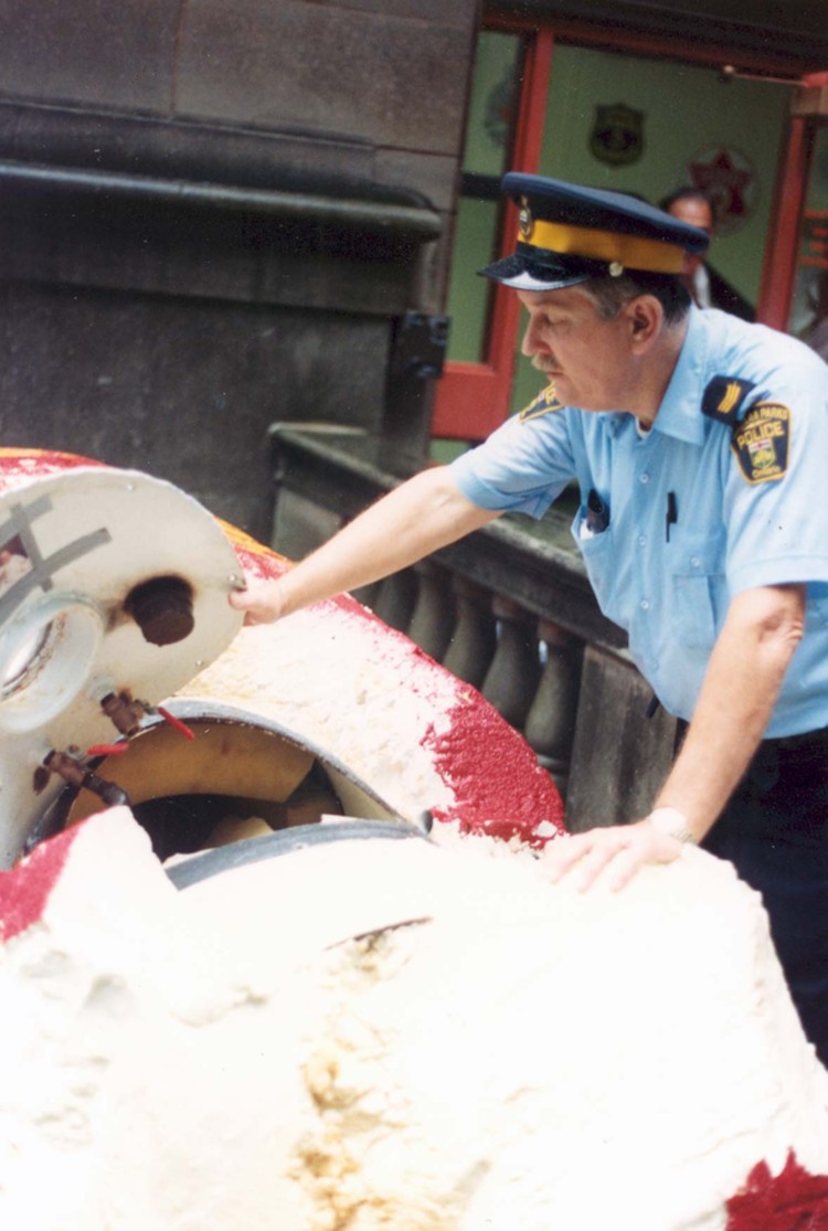 Barrel used by John "David" Munday in his aborted attempt to go over the Horseshoe Falls in 1990 being confiscated by police