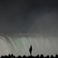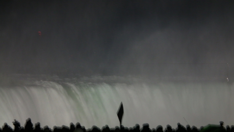 - en-CA Wallenda can barely be seen through the mist about 1/3 of the way in from the left - underneath and to the right of the red lights