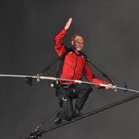 en-CA Nik Wallenda on the tightrope over the Horseshoe Falls. He was the first person in over 100 years to cross the gorge on a tightrope and the first to go over any portion of the falls. He began his walk on the American side at 10:15 p.m. and completed the walk in 25 minutes. Near the end of his journey he bent to one knee and pumped his fist in the air.