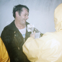 John "David" Munday being interviewed after going over the Horseshoe Falls in a barrel