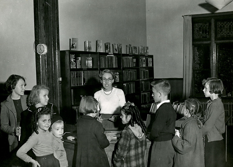 - Helen Lothian surrounded by children in Niagara Falls Public Library