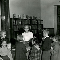 Helen Lothian surrounded by children in Niagara Falls Public Library