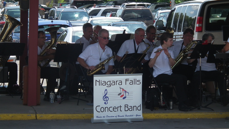 - en-CA Niagara Falls Concert band plays in the parking lot behind the museum. Sign reads: Niagara Falls Concert Band under the direction of Brenda Fairchild-Green.