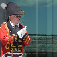 - en-CA In front of the rear entrance to the museum. Don Jackson dressed as General Drummond.
