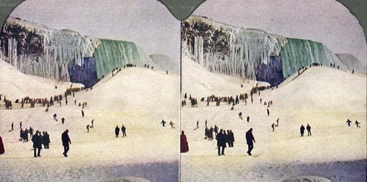 - en-CA Description on back: The grandeur and loveliness of the Niagara Falls in summer is replaced in winter by a not less majestic but more forbidding aspect. The mighty sweep of the waters does not allow of any formation of ice in the rapids above or below the falls, but at the edges of the river, in the shallows, snows of heaven descend to add their pure white to the glistening green of the rushing waters, the deep purple of the ice behind the flowing curtain and the brilliant hues of the giant icicles reflecting the rays of the sun. And however long a visitor may linger, new beauties will presnt themselves, and the greater will be his appreciation with every moment.