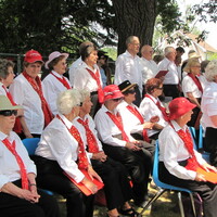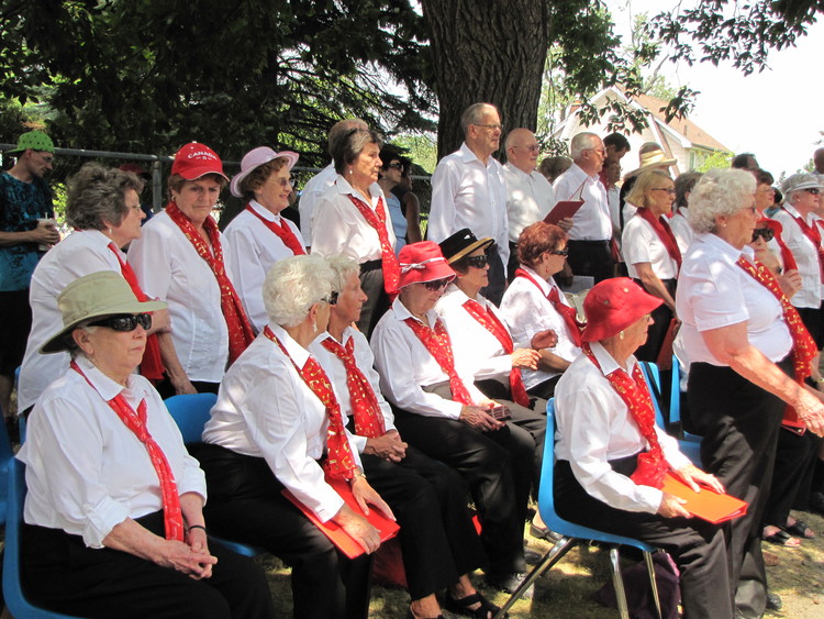- en-CA A group of females watch the ceremony. All have scarves with music notes on them. Possibly a choir group.