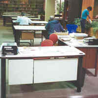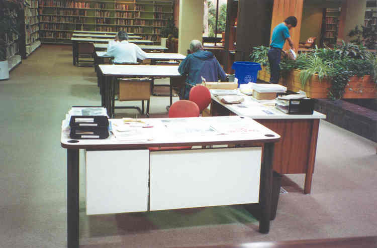 - en-CA Niagara Falls Public Library - Victoria Interior Work tables with pond to the right.