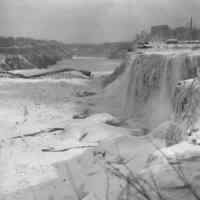 - en-CA An ice jam in January 1938 caused the Falls View Bridge to collapse on the 27th. Onlookers can be seen on Luna Island in the foreground. Several people are also gathered just south of the bridge on the ice.