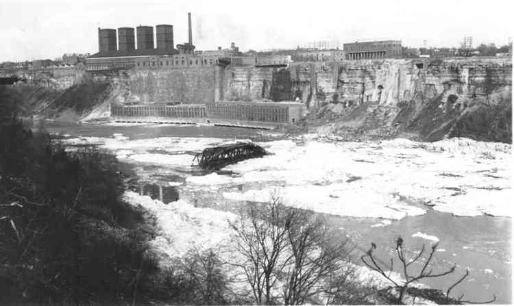 - Piece of the collapsed Falls View Bridge floating past the Schoelkopf Power Plant.