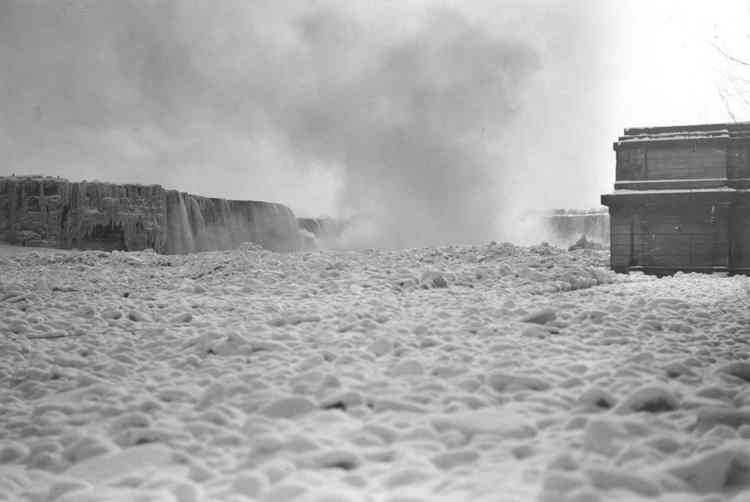 - en-CA The Ontario Generating Station can be seen to the right. The Horseshoe Falls are only partly visible because of the height of the ice bridge.