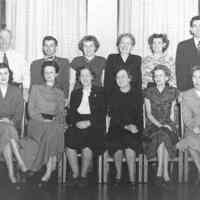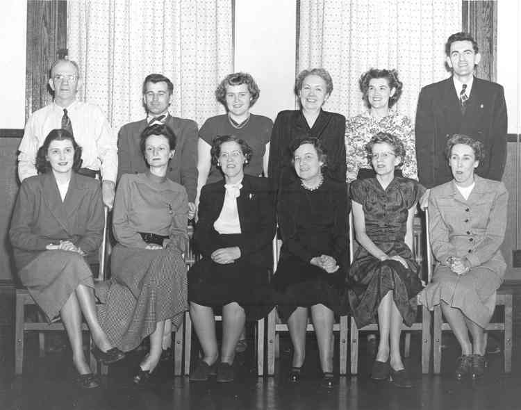 - en-CA Front Row: Helen Sehl (Branch Librarian), Grete Melson, Ruby Wallace, Edith Goodsir, Edith Albrant, Helen Lothian. Back: W.J. Sinclair (Janitor), Dan Alchuk, Frances Stokes (part-time), Eva Vannalter (part-time), Kathryn Smith, Michael Donovan. Two copies of photograph.