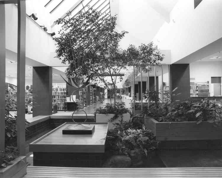 - en-CA The Niagara Falls Public Library on Victoria Avenue. The fountain in the middle of the library.