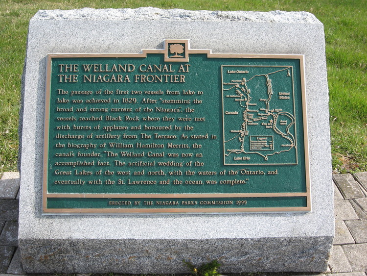 - en-CA Plaque near Miller's Creek along the Niagara Parkway: The Welland Canal at the Niagara Frontier. The passage of the first two vessels form lake to lake was achieved in 1829. After “stemming the broad and strong current of Niagara”, the vessels reached Black Rock where they were met with bursts of applause and honoured by the discharge of artillery from The Terrace. As stated in the biography of William Hamilton Merritt, the canal's founder, “The Welland Canal was now an accomplished fact. The artificial wedding of the Great Lakes of the west and north with the waters of the Ontario, and eventually with the St. Lawrence and the ocean was complete”