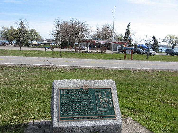 - en-CA Plaque near Miller's Creek along the Niagara Parkway: The Welland Canal at the Niagara Frontier. The passage of the first two vessels form lake to lake was achieved in 1829. After “stemming the broad and strong current of Niagara”, the vessels reached Black Rock where they were met with bursts of applause and honoured by the discharge of artillery from The Terrace. As stated in the biography of William Hamilton Merritt, the canal's founder, “The Welland Canal was now an accomplished fact. The artificial wedding of the Great Lakes of the west and north with the waters of the Ontario, and eventually with the St. Lawrence and the ocean was complete”