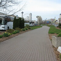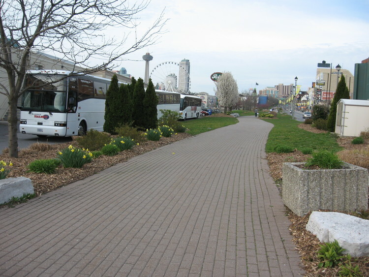 - en-CA Pedestrian Walkway along the path of the old Canadian Pacific Railway Tracks along Victoria Avenue. In the background the giant ferris wheel, the Skylon Tower and various hotels can be seen.