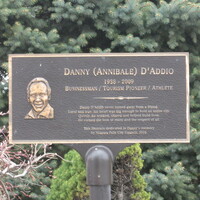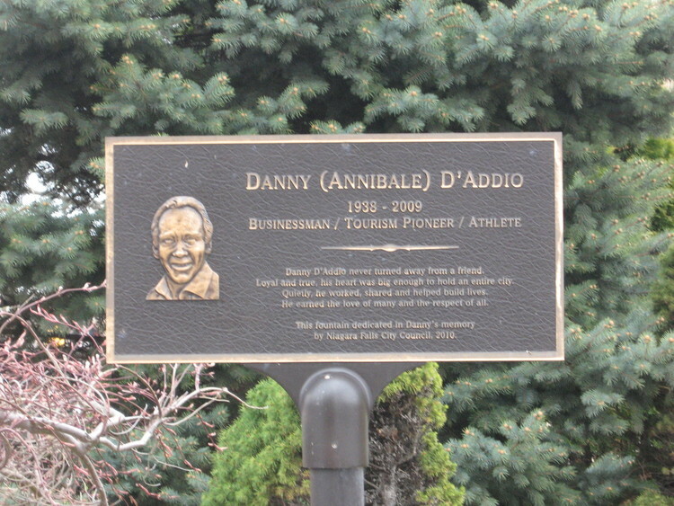 - en-CA Memorial plaque and fountain at the sidewalk along Victoria Avenue and Bender Street. The plaque reads : Danny (Annibale) D'Addio 1938-2009. Businessman/Tourism Pioneer/ Athlete. Danny D'Addio never turned away from a friend. Loyal and true, his heart was big enough to hold an entire city. Quietly he worked, shared and helped build lives. He earned the love of many and the respect of all.