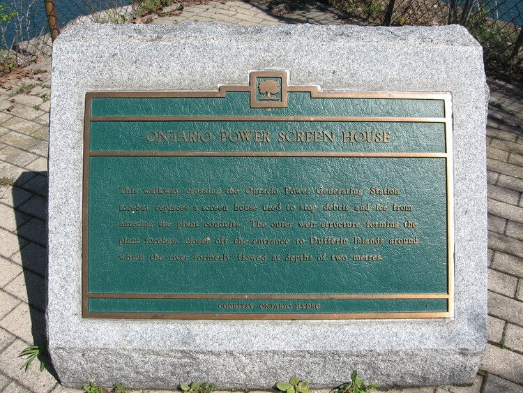 - en-CA Plaque: Ontario Power Screen House. The walkway crossing the Ontario Power Generating Station forebay replaces a screen house used to stop debris and ice from entering the plant conduits. The outer weir structure forming the plant forebay closes off the entrance to Dufferin Islands around which the river formerly flowed at depths of two metres.