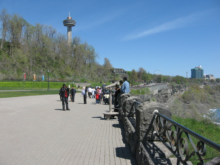 en-CA Tourists sitting on the safety fence near the falls. The Skylon Tower, Table Rock House, Niagara Skywheel and Sheraton on the Falls Hotel in the background