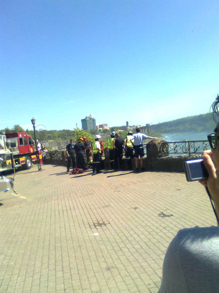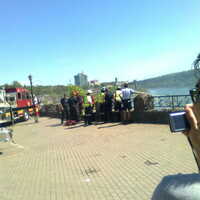 - en-CA Fire department and police preparing to retrieve a person on the rocks below who went over the Horseshoe Falls and survived