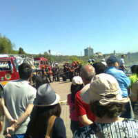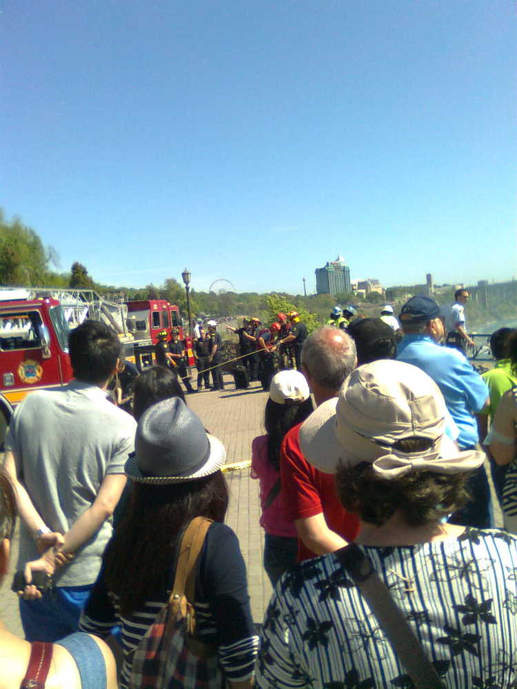 - en-CA Fire department and police preparing to retrieve a person on the rocks below who went over the Horseshoe Falls and survived