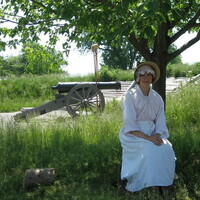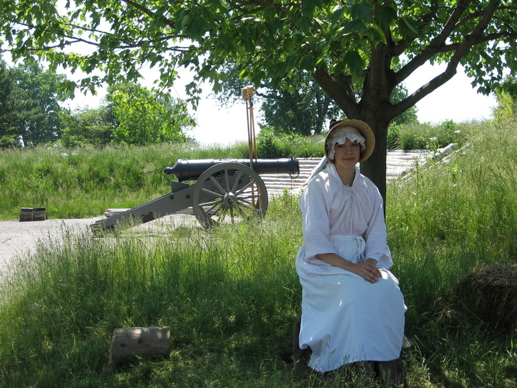 - en-CA Employee in period costume inside Fort Erie with replica of a cannon in the background