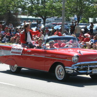 - en-CA Kim Craitor, MPP riding in a classic chevrolet in the Canada Day parade on Morrison Street near Optimist Park