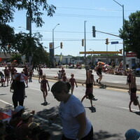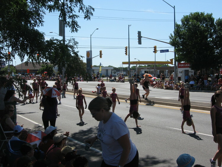 - en-CA Quantum Gymnastics and AcroCats doing handstands and cartwheels in the Canada Day parade on Morrison Street near Optimist Park
