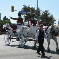 - en-CA Grand Parade Marshall of the Canada Day parade in a horse drawn carriage on Morrison Street near Optimist Park