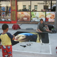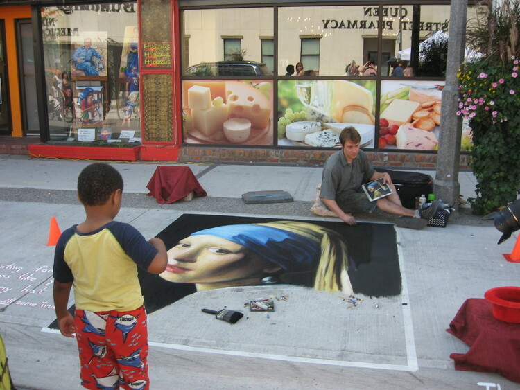 - en-CA A street artist and his sidewalk painting. Queen Street, south side, across from Queen Street Pharmacy.