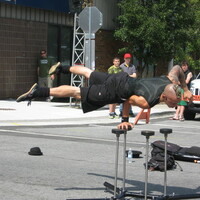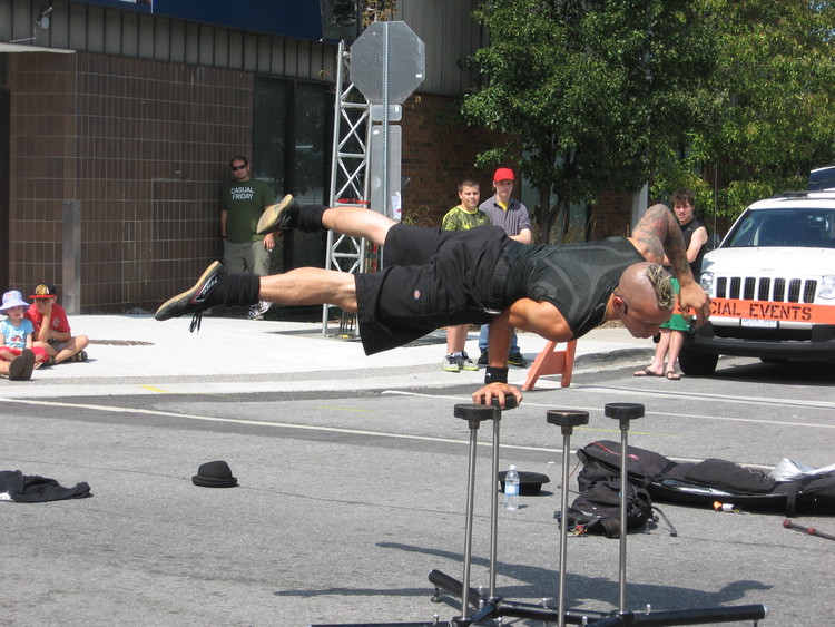 - en-CA Acrobat Reuben Dot Dot Dot spinning on one-handed hand stand at the intersection of Queen Street and St. Clair Avenue. 4481 Queen Street building visible in the background.