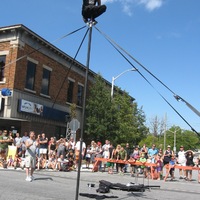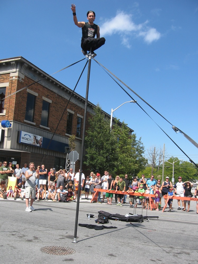 - en-CA Acrobat Reuben Dot Dot Dot performing on a pole at the intersection of Queen Street and St. Clair Avenue. Spectators and the building at 4481 Queen Street is visible in the background.