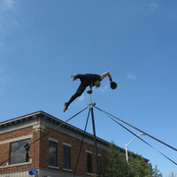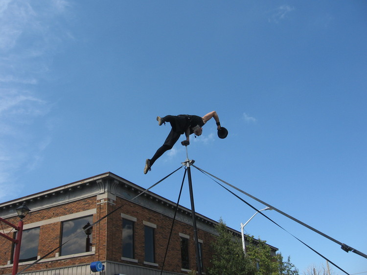 - en-CA Acrobat Reuben Dot Dot Dot spinning one-handed on a pole at the intersection of Queen Street and St. Clair Avenue. Spectators and the building at 4481 Queen Street is visible in the background.