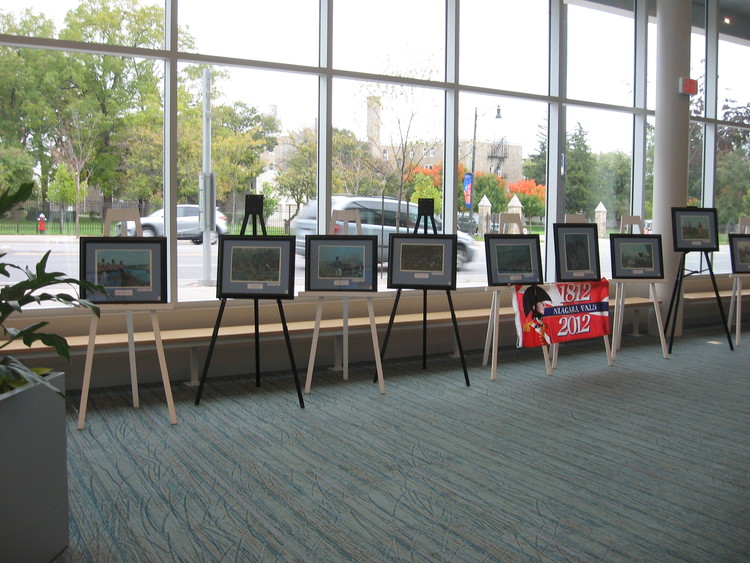 - en-CA War of 1812 art displays (1812 Commemorative Fund) by the Niagara Falls Public Library at the Scotiabank Convention Centre for the Niagara Concerts' War of 1812 Celebration Concert.Mount Carmel is visible in the background.